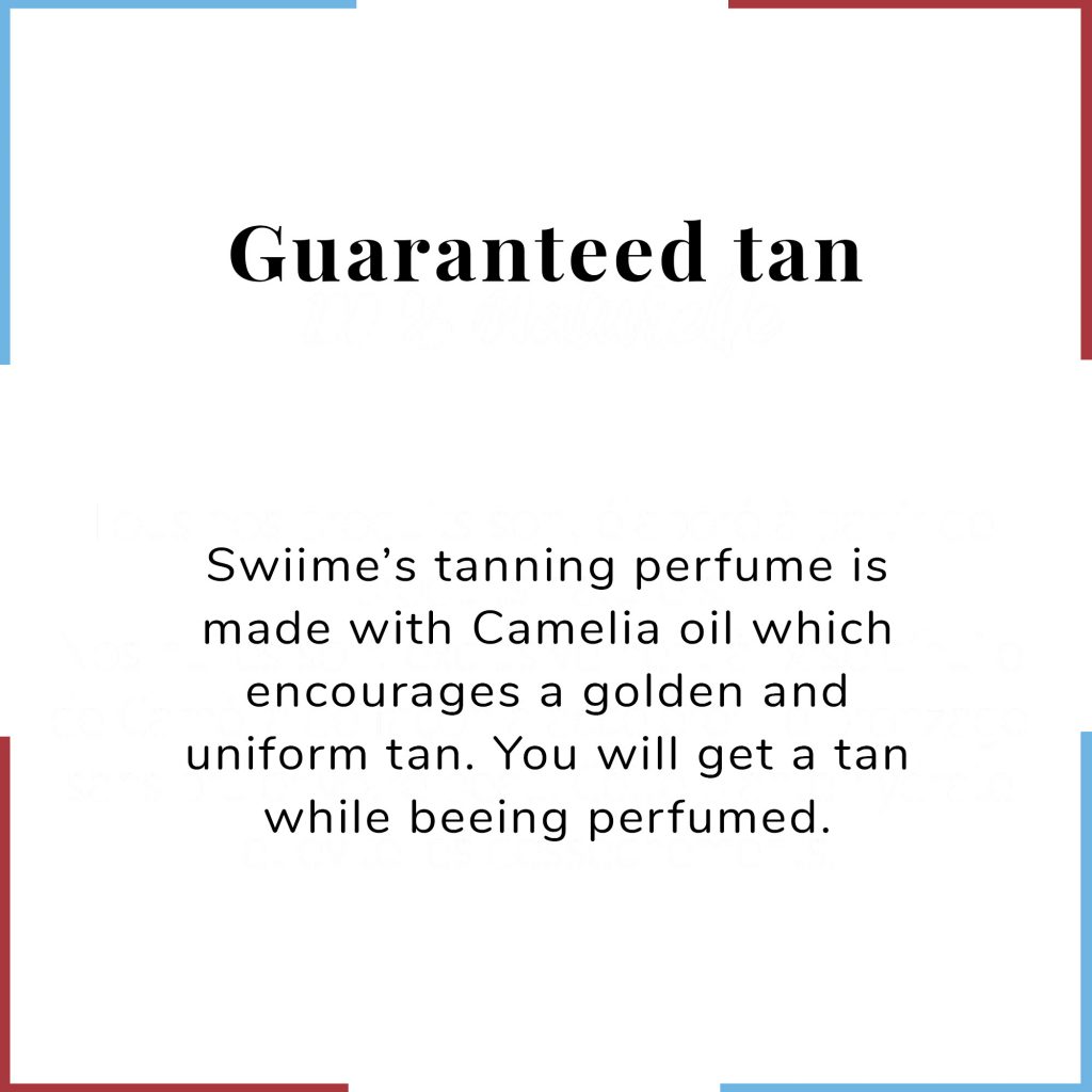 The ultra-fresh and satiny Swiime tanning perfume sublimates the skin and the tan. Our priority is to offer a 100% French product that is pleasant, fragrant and with an exceptional longevity on the skin. The difference with a traditional tanning oil is that we use Camelia oil, known for its moisturizing and ultra-tanning power.