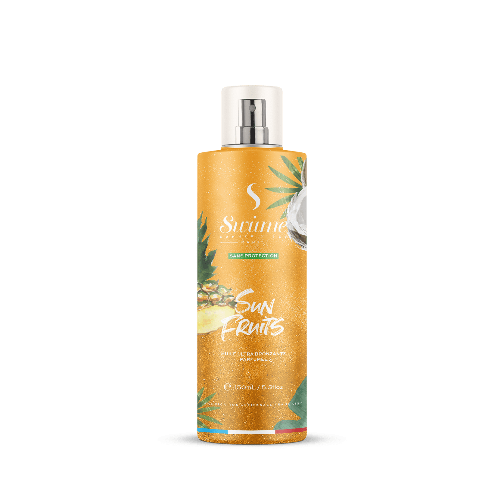 Succombez au plaisir du parfum ultra bronzant pailleté or Sun Fruits! Enfin une huile bronzante qui vous permet d’accélérer votre bronzage tout en protégeant votre peau. Nous utilisons de l’huile de Camélia pure à  97% non diluée,  ainsi cela hydrate, protège et nourri votre peau.